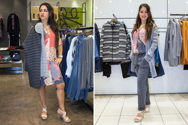 foto 2: Il total look indossato da Simona comprende una t-shirt bimaterica dai colori caldi e accesi, apprezzata per la sua linea morbida. In abbinamento il pantalone Madrid, un cotone molto soffice ed elasticizzato, sostenuto da una cintura semplice ma fashion. A completare il look è una giacca da un tessuto avvolgente e un colore di tendenza e una collana con nappine color rame. Ideale per la donna con uno stile sporty chic, quotidiano ma non banale.