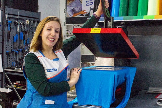 Il motivo viene di seguito “spellicolato”, prima di essere incollato a caldo sul tessuto grazie ad una pressa.
