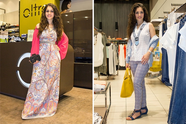 Nel secondo total look Simona indossa una camicia bianca in sangallo con Capri micro fantasia blu/celeste che rievoca la moda anni ‘60/'70. Per completarne il look felpa celeste polvere coperta di paillettes trasparenti con cappuccio con inserto in raso e shopping bag rigorosamente gialla, per la donna che ama seguire la moda senza rinunciare a splendidi colori pastello. Per la donna che ama osare con gusto.