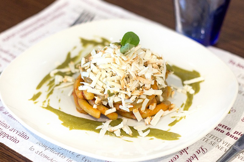 Al coffee restaurant Bahira che si affaccia sulla piazza del Parco Corolla l’hanno rivisitata per un buon primo piatto già pronto all’ora di pranzo: pomodoro fresco, crema di melanzane, salsa di basilico e spolverata di ricotta infornata.
