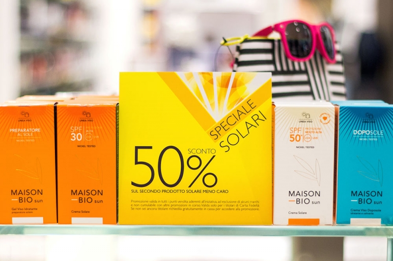 Prodotti per l'esposizione della pelle al sole: crema solare SPF 50, per le pelli molto chiare che necessitano di una protezione molto alta, latte solare con SPF 15 o 30, per coloro che necessitano di una protezione alta o media, olio solare SPF 10, per pelli scure o già parzialmente abbronzate.