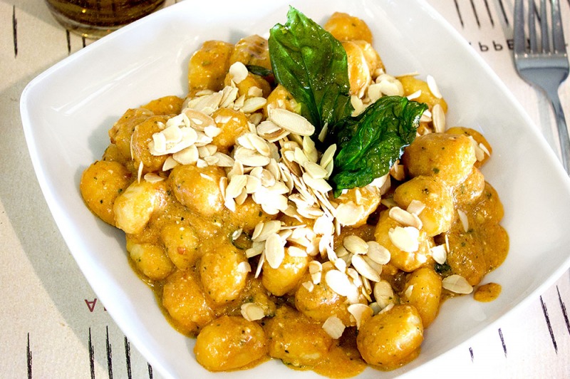 Ecco così spiegata l’aggiunta delle mandorle e dei pomodori freschi.