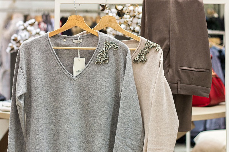 Almeno secondo Oltre che propone capsule di maglie in cachemire nelle nuance del beige rosso e grigio mélange alcune impreziosite da strass.