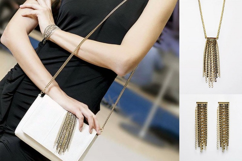 Collane e orecchini con frange a catena color oro.