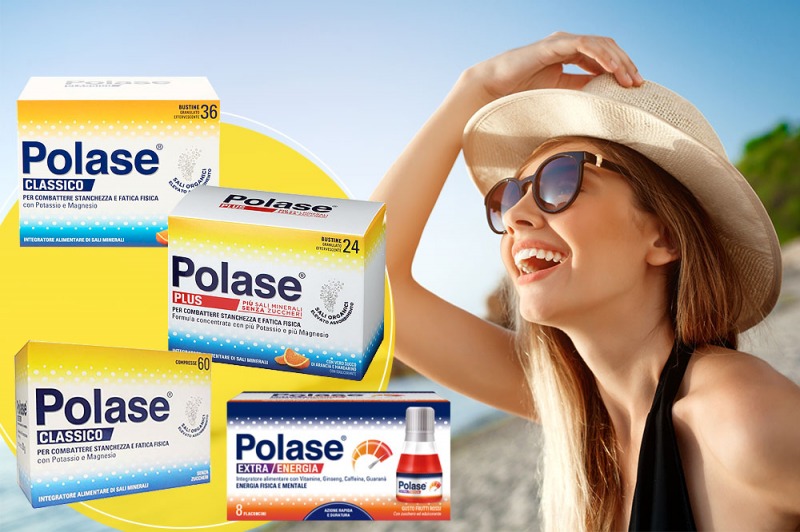 Polase, infatti, è lo storico integratore alimentare di Potassio e Magnesio che aiuta a combattere stanchezza e fatica fisica dovuta al caldo.