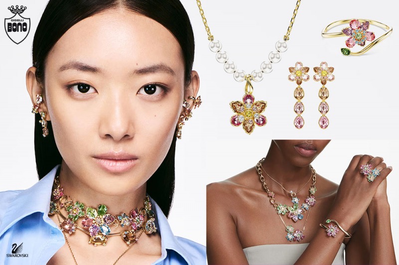 Ogni gioiello è impreziosito da tagli misti, tonalità multicolore e delicati dettagli a tema floreale, il tutto montato su metalli dorati o placcati rodio, che esaltano il luminoso design Swarovski.