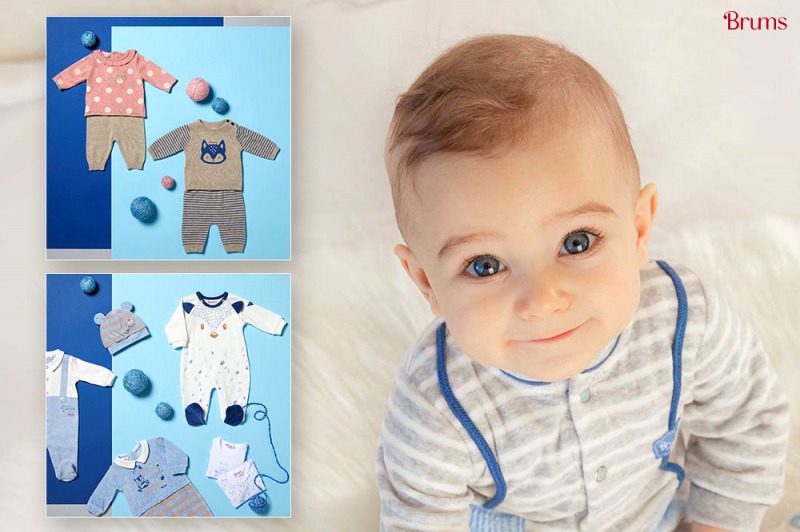 Dedicata ai maschietti, Cielo è un tema di Brums caratterizzato dall’azzurro melange su basi rigate tinto filo e unite con interventi di un colore dai toni caldi come il beige melange.
