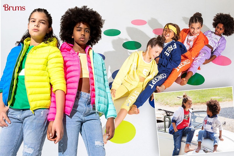 La proposta per i piccoli si divide nella parte sportiva molto curata con le immancabili tute e una proposta moderna e intercambiabile con colori pastello.