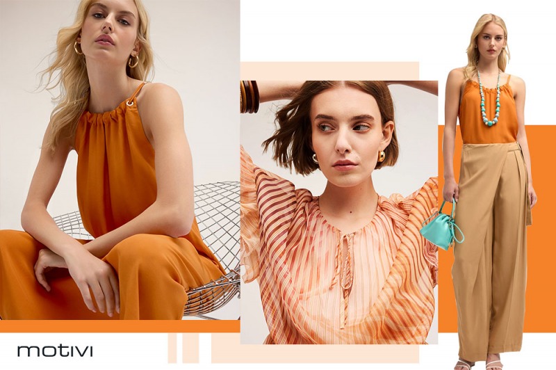 Non abbiate paura di osare con il total look arancio: la gonna in chiffon di viscosa, possiamo trattarla in chiave più elegante che informale come per la donna Motivi che dopo l’ufficio va a fare aperitivo.