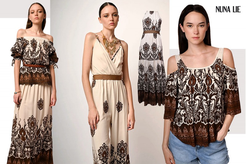 Color cioccolato mescolato a sfumature color caramello per la nuovissima stampa dai richiami orientali dell’ultima capsule firmata Nuna Lie.