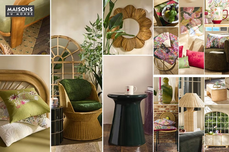 La collezione del negozio Maisons du Monde del Parco Corolla di Milazzo reinventa i codici delle case classiche francesi, iniettandoci una dose di elementi naturali e di artigianato. Rattan e vimini definiscono l’anima della collezione: dalla sedia dalle curve avvolgenti, allo spettacolare specchio floreale. Questi materiali caldi si combinano con tocchi di verde intenso e stampe vegetali oniriche, come un giardino interno accogliente di una calda casa di famiglia.