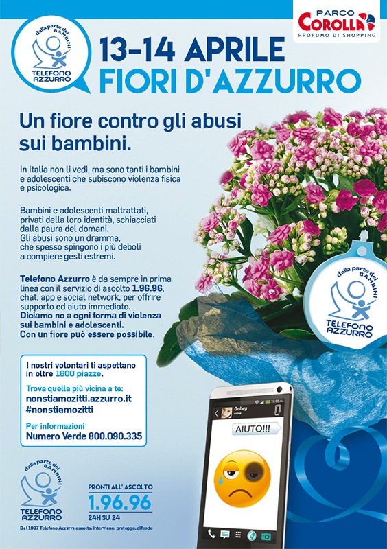 Il 13 e 14 aprile presso la Galleria del Parco Corolla saranno presenti i volontari del Telefono Azzurro con l'iniziativa "Fiori d'Azzurro". Un weekend di sensibilizzazione contro gli abusi nei confronti di bambini e adolescenti. Il simbolo dell'iniziativa è la calancola di Telefono Azzurro: un fiore scelto per simboleggiare la vulnerabilità e delicatezza che tutti noi siamo chiamati a proteggere e preservare da qualsiasi forma di abuso o violenza. I volontari distribuiranno i fiori di Telefono Azzurro per raccogliere fondi indispensabili al loro lodevole intervento in difesa dei bambini e degli adolescenti vittime di violenze e soprusi.   Diciamo no a ogni forma di violenza sui bambini e adolescenti. Con un fiore può essere possibile!