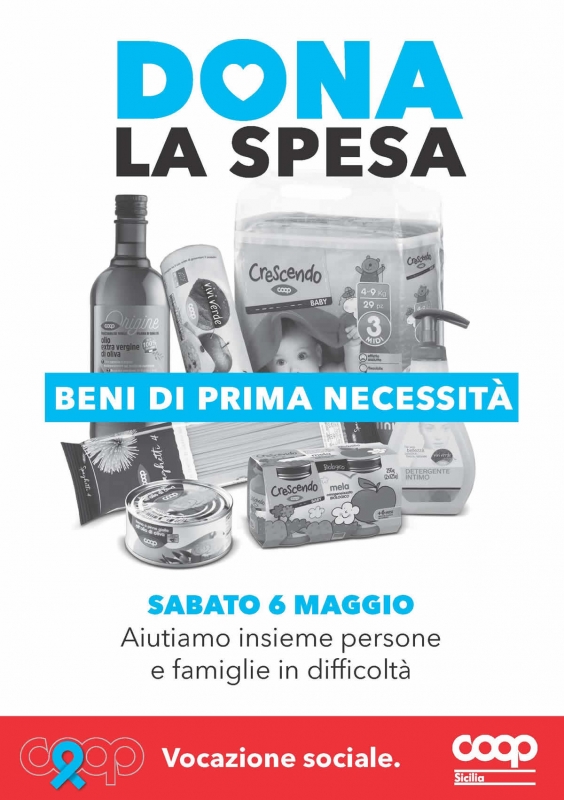 Sabato 6 Maggio: una giornata solidale di raccolta e sostegno alle famiglie bisognose del territorio. Nell’ Ipercoop del parco Corolla, ed in tutti gli Ipercoop ed i Supermercati di Coop Sicilia, potranno essere donati prodotti alle associazioni di volontariato presenti all’uscita dei punti vendita. Puoi donare i seguenti prodotti: - OLIO - TONNO E LEGUMI IN SCATOLA - FARINA - ZUCCHERO - BISCOTTI E PRODOTTI PER LA COLAZIONE - PASTA E RISO - PRODOTTI A LUNGA CONSERVAZIONE - PRODOTTI PER L’IGIENE DELLA PERSONA E DELLA CASA - PRODOTTI PER L’INFANZIA Vuoi saperne di più? https://www.coopalleanza3-0.it
